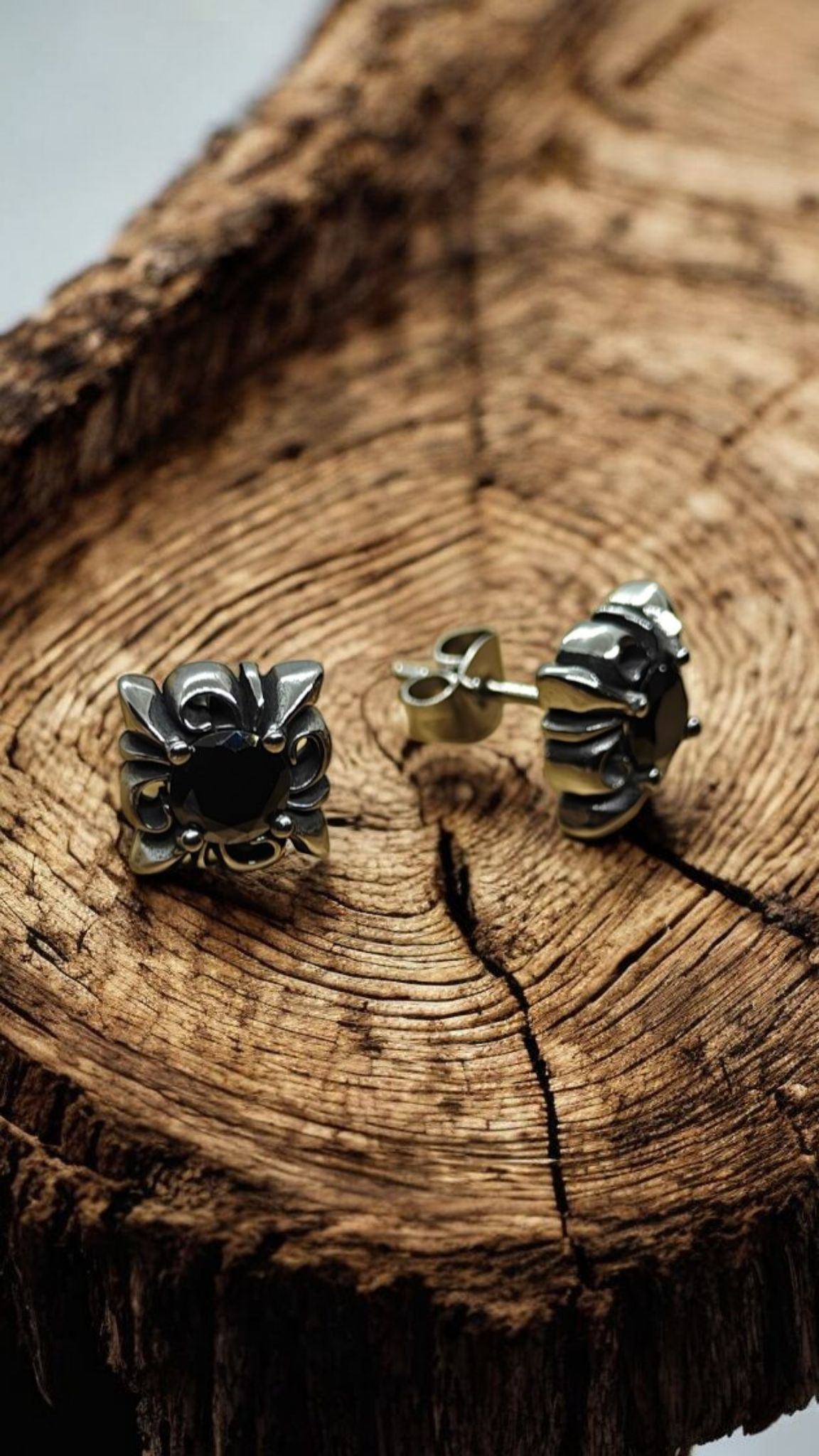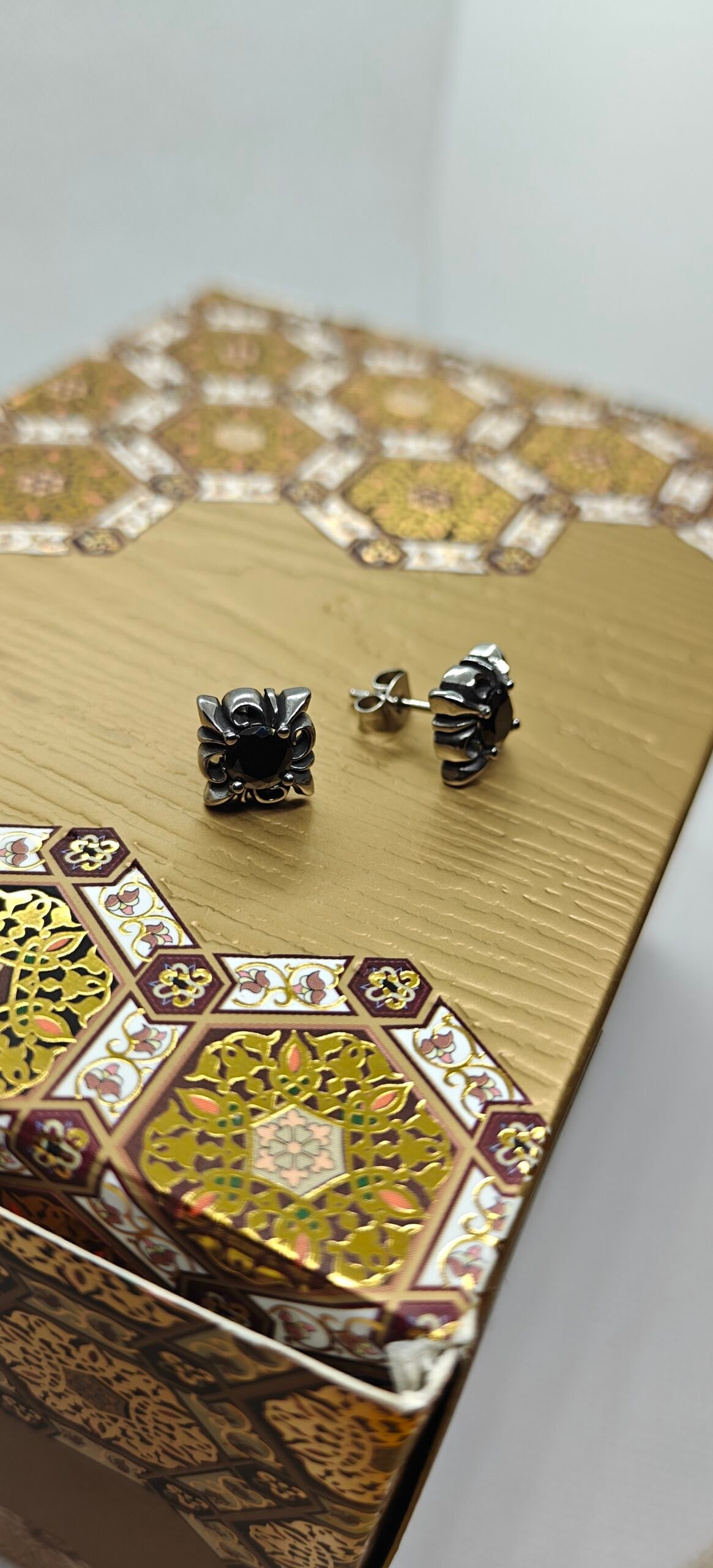 Featuring a dark gemstone centerpiece framed by a sculpted gothic-style stainless steel setting, these studs strike the perfect balance between elegance and rebellion.