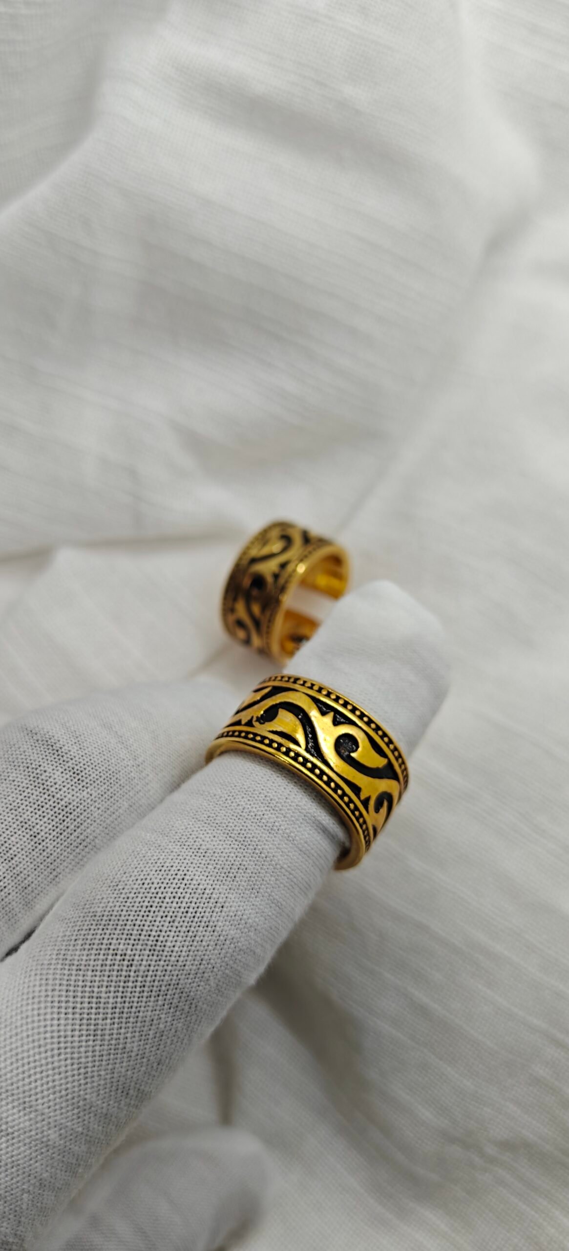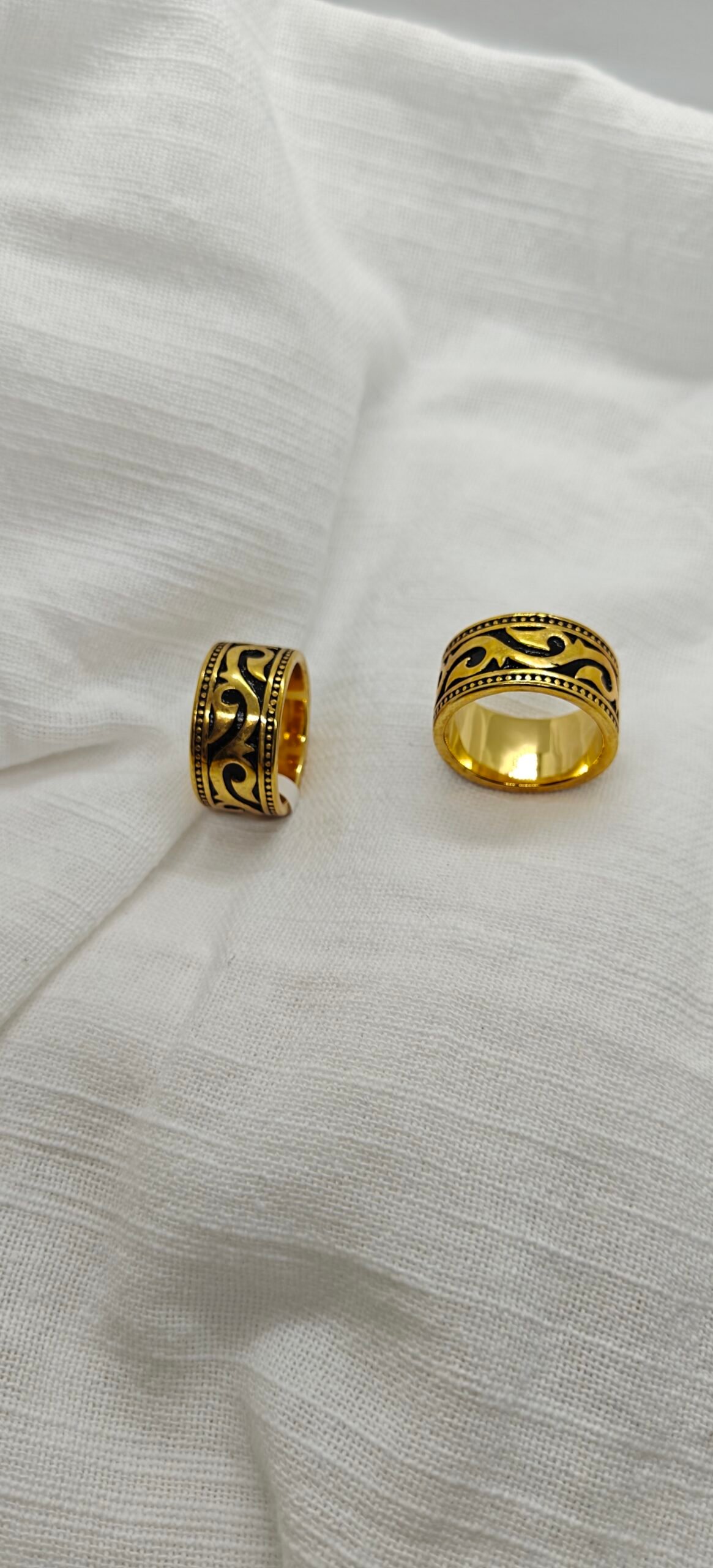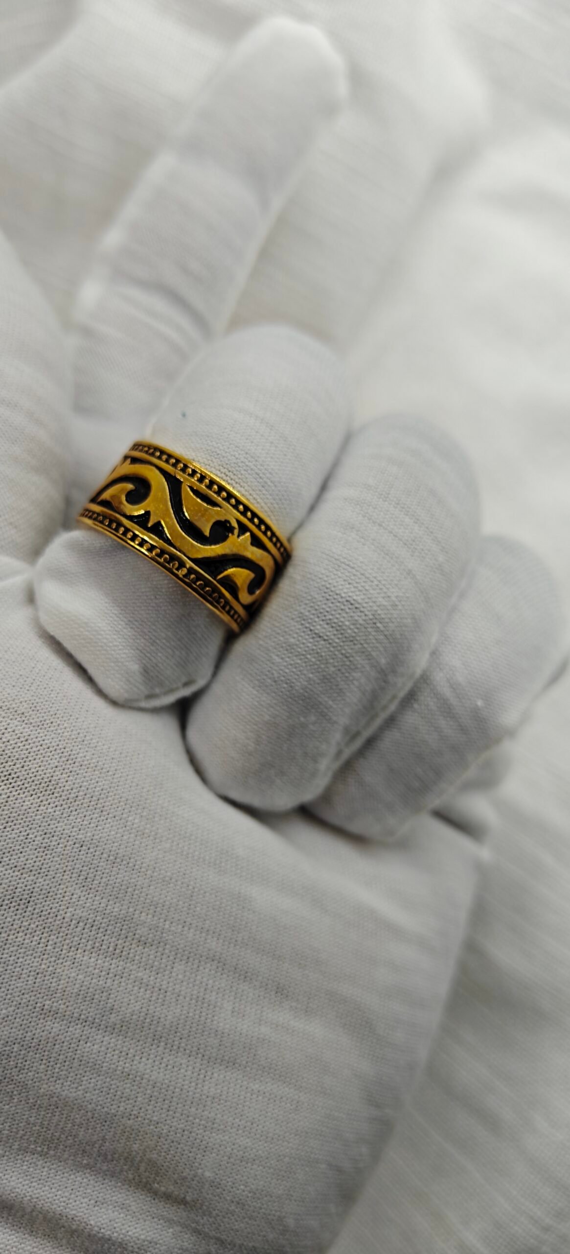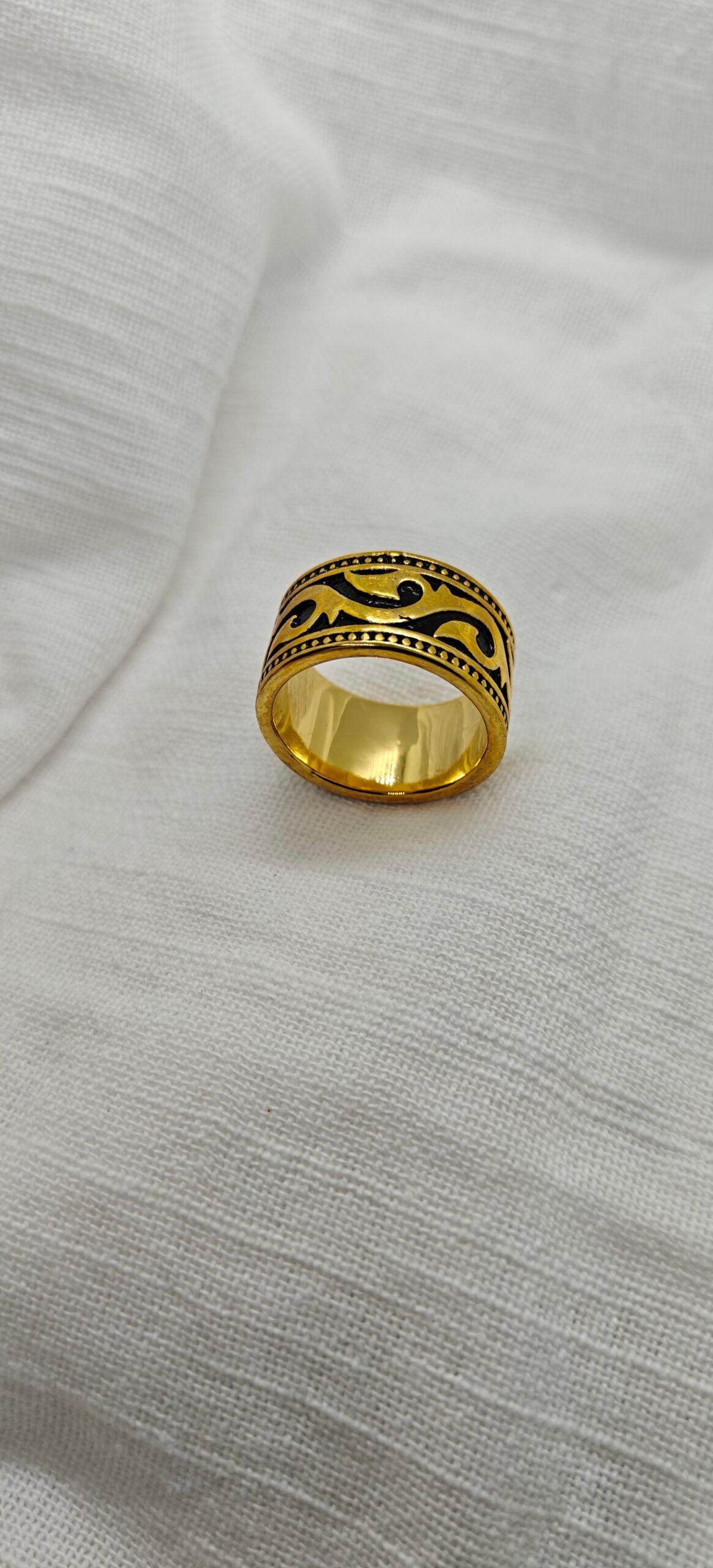 Gold plated stainless steel tribal pattern ring on white fabric