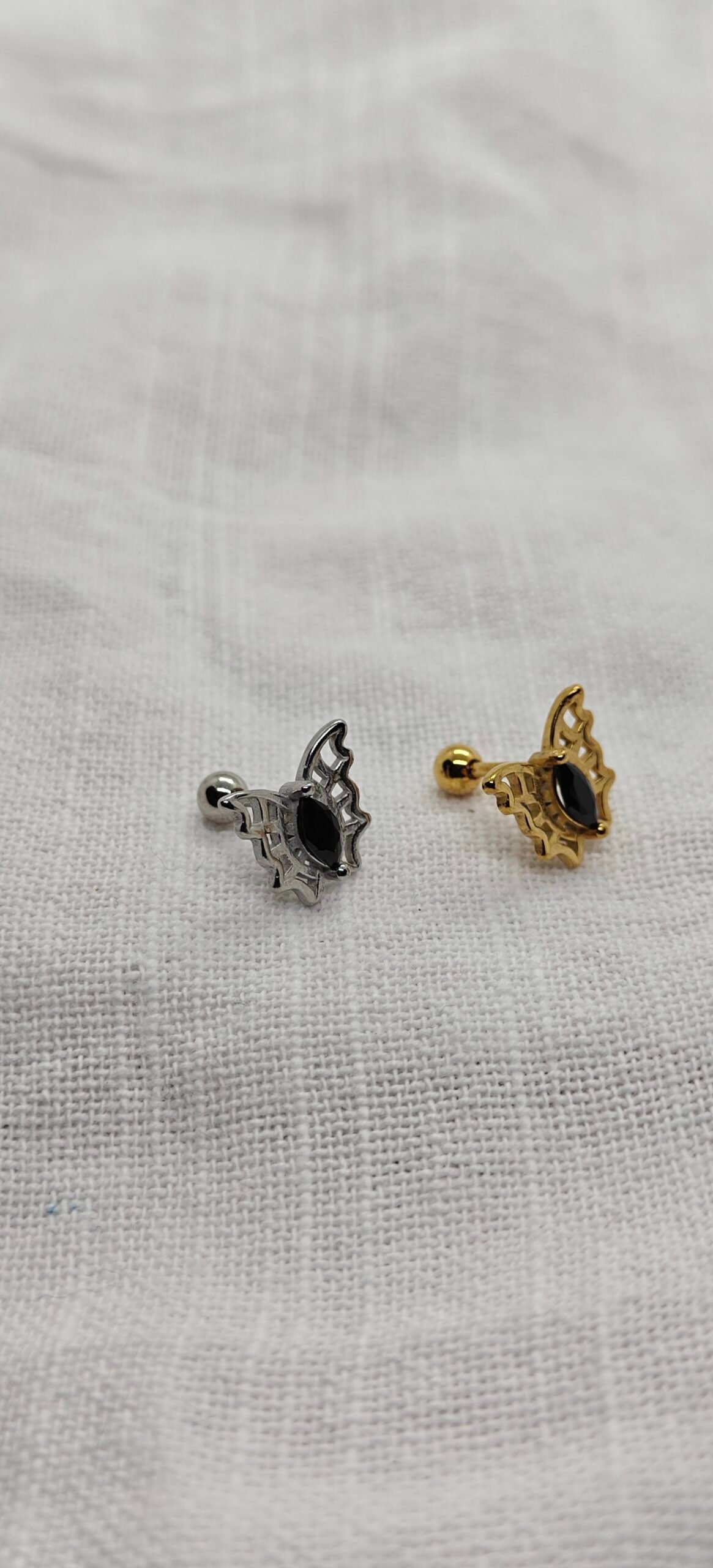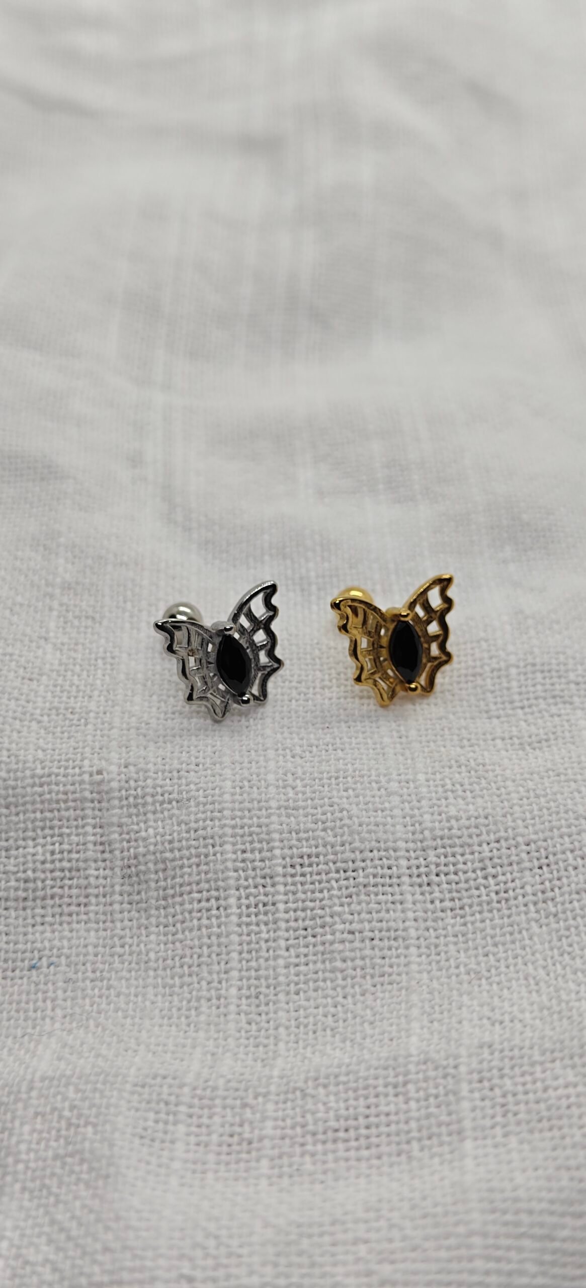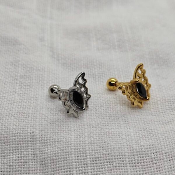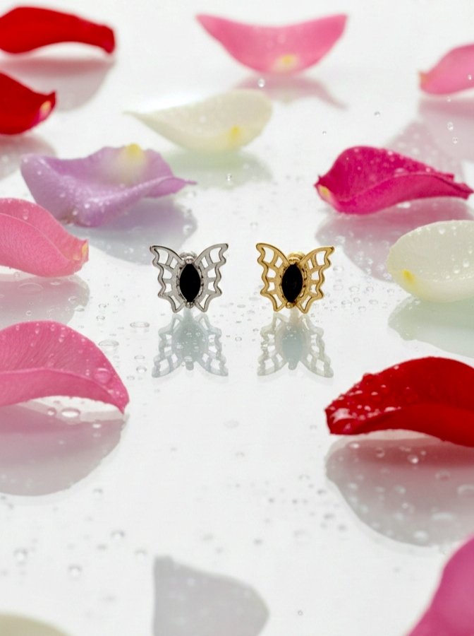 These butterfly stainless steel earrings offer a playful yet classy look. With a black oval center stone and elegant cutout wings, they flatter all face shapes. Available in polished silver-tone stainless steel or gold-plated stainless steel.