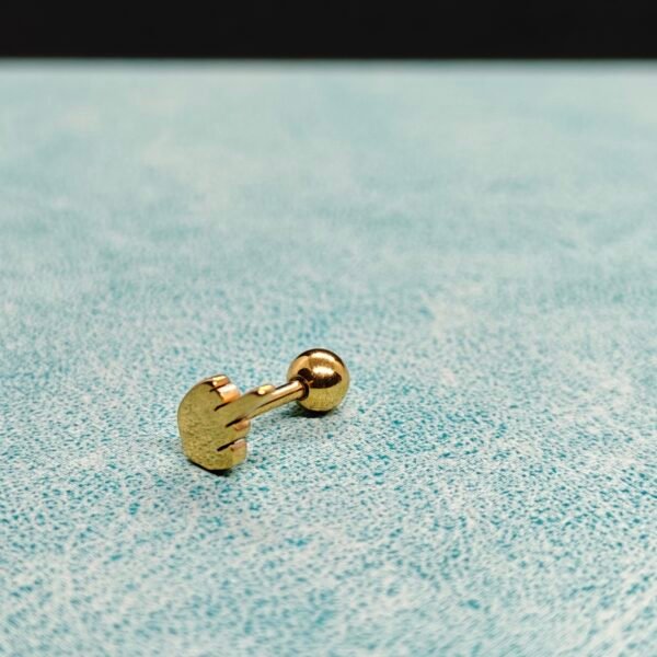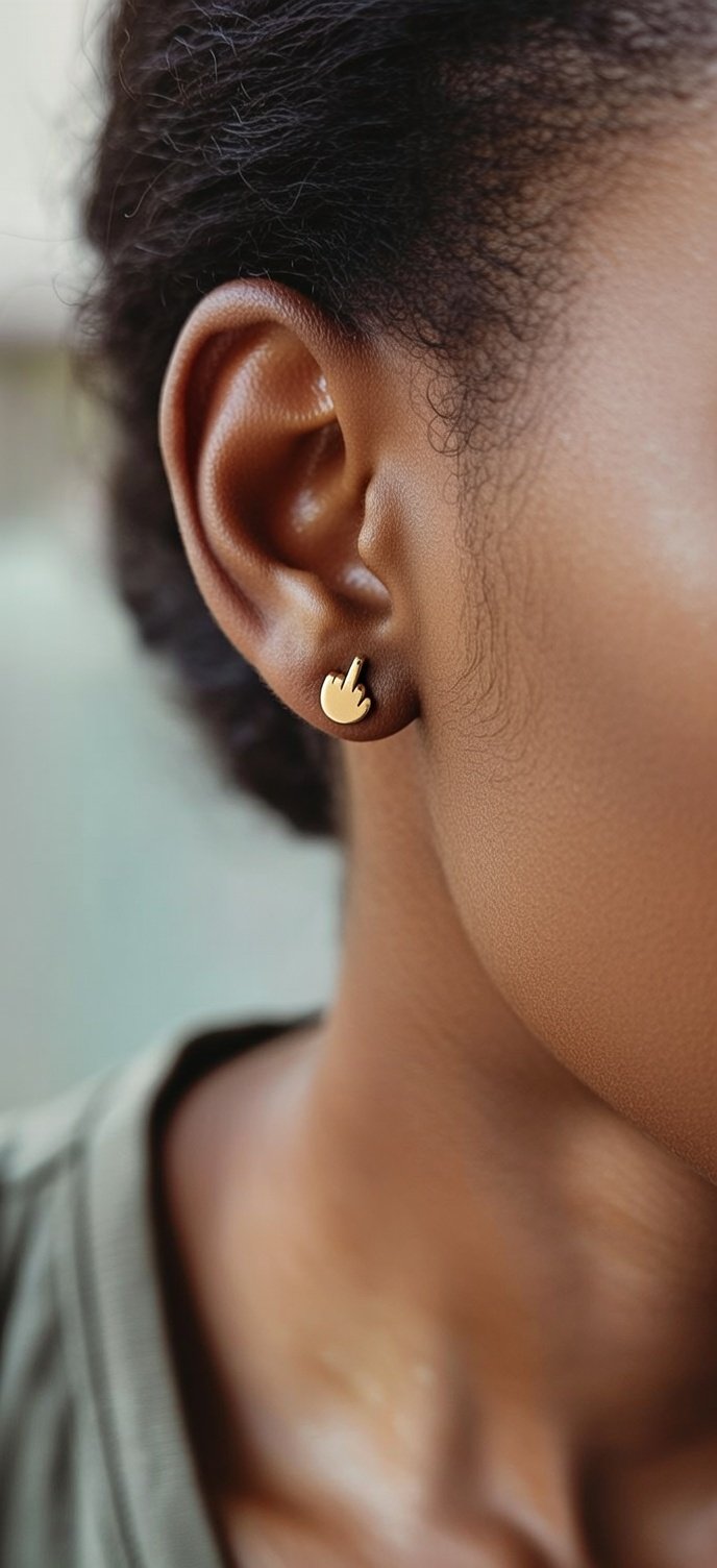 “Gold stainless steel hand screwback stud earring worn on ear.”