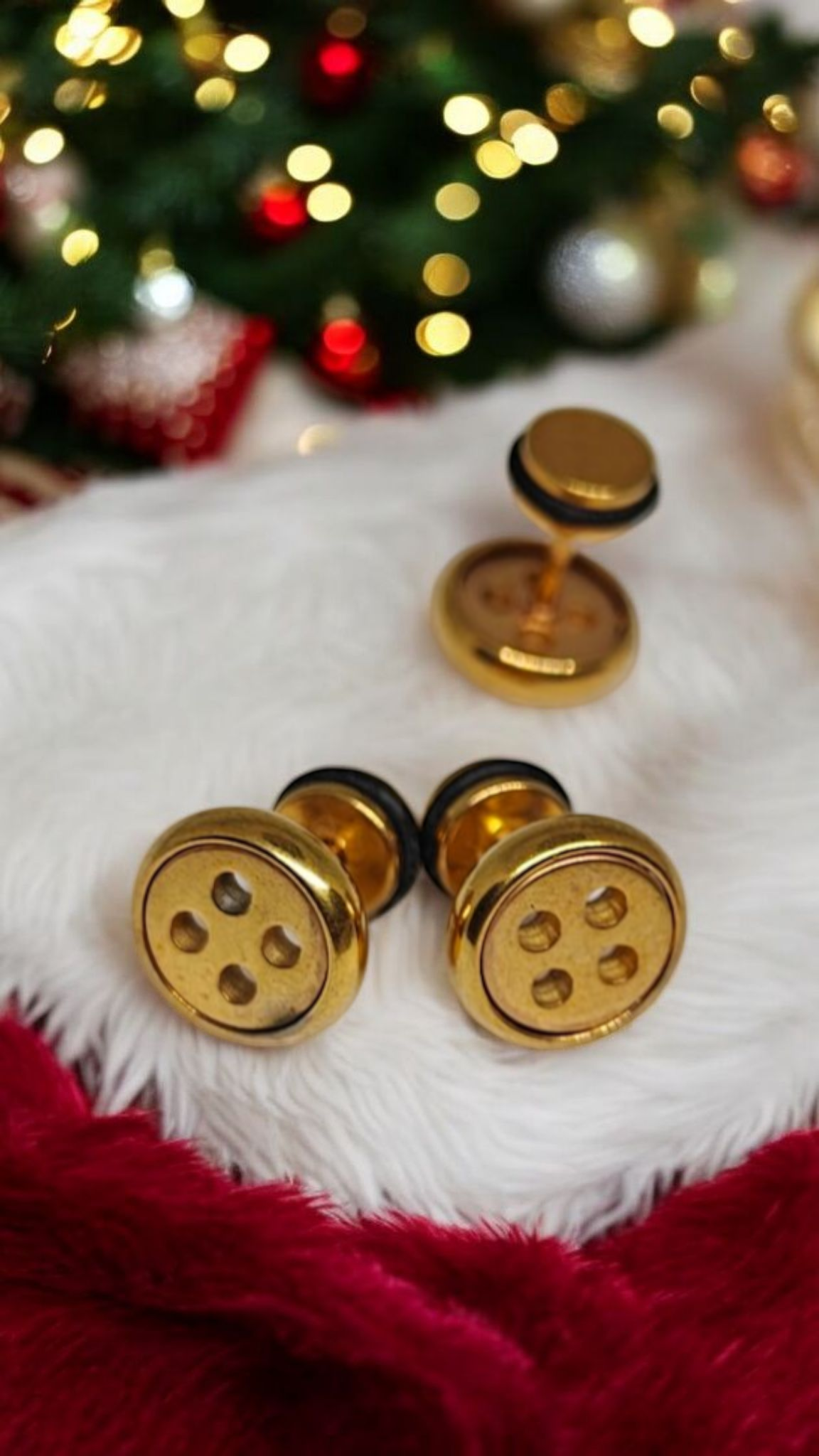 Gold plated stainless steel button screw back earrings on white and red fabric with festive lights in background