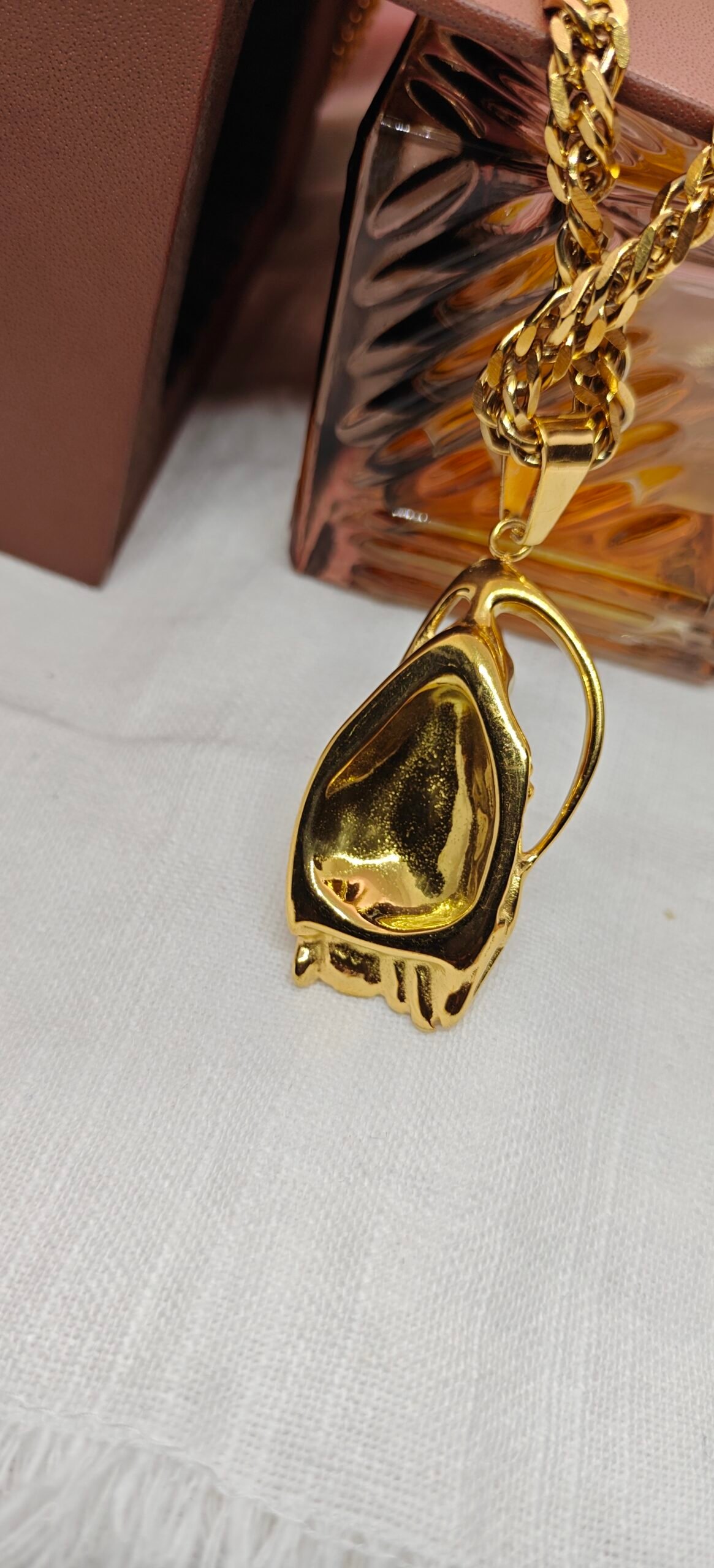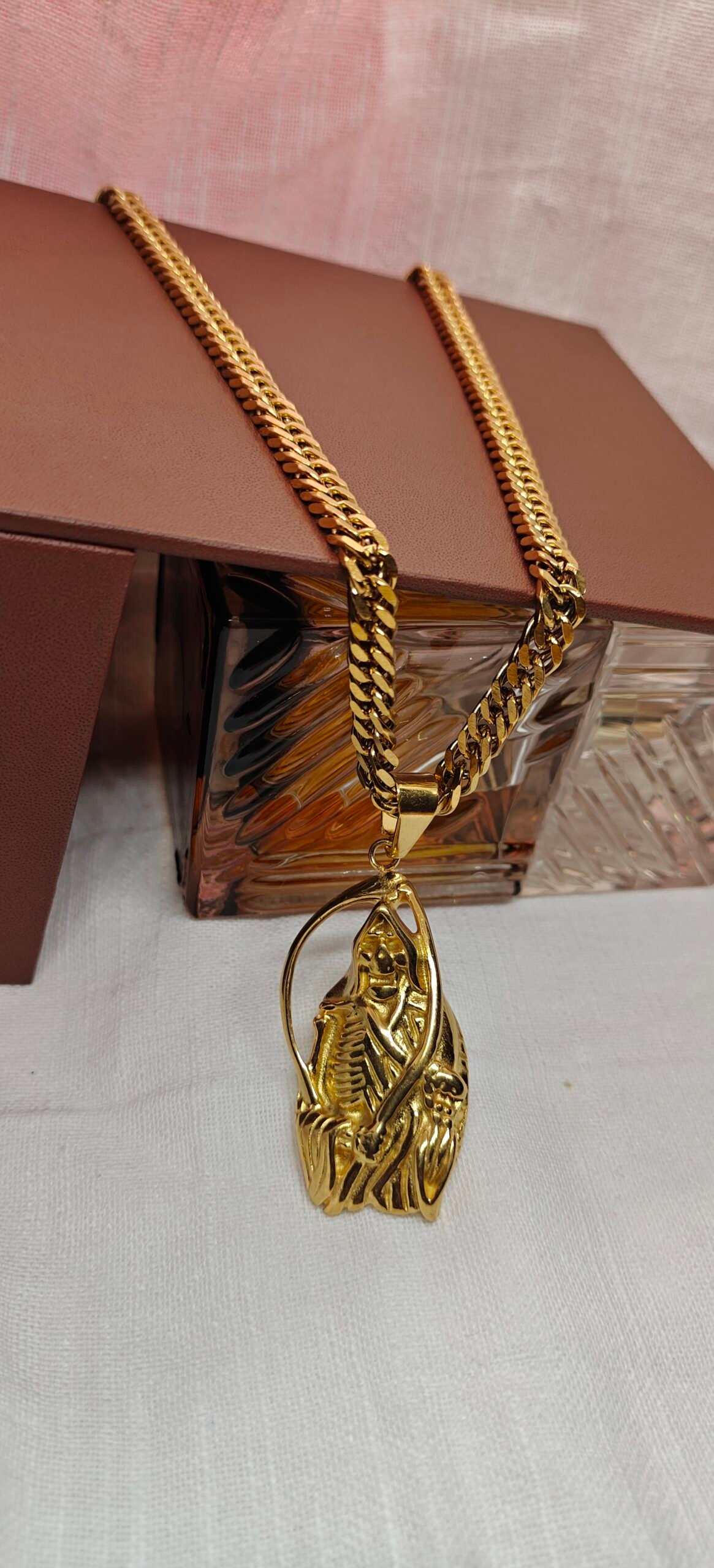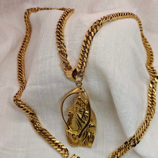 Make a bold statement with this gold stainless steel skeleton pendant necklace. Featuring a detailed skeleton design and a thick curb chain, this piece delivers durability, shine, and standout style for everyday wear.