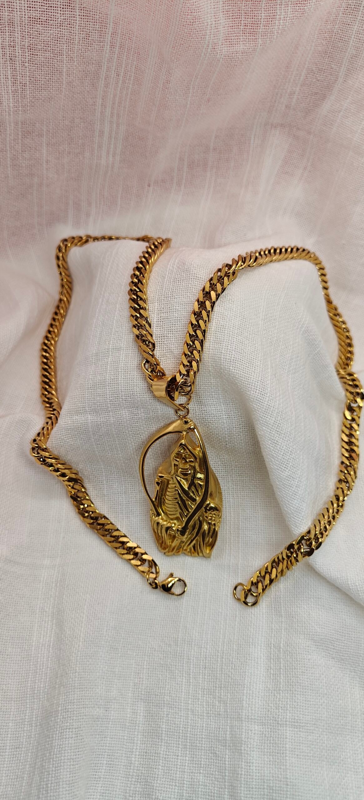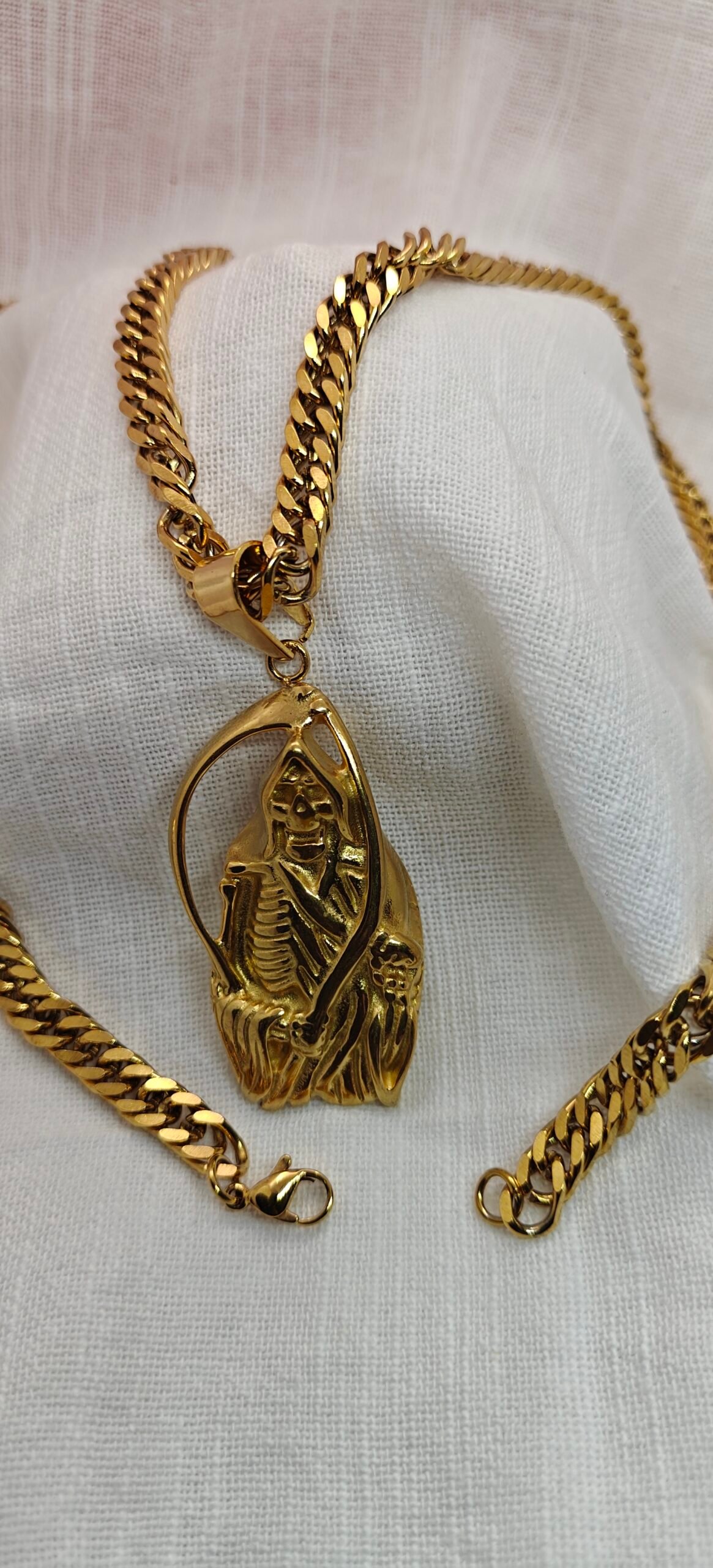 Bold gold stainless steel skeleton pendant necklace with a heavy curb chain. Durable, tarnish-resistant, and perfect for streetwear or statement styling.